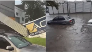 En este marco de tormentas, en el barrio porteño de Pompeya se cayó un cartel publicitario ante fuertes vientos y se llevó puestos dos autos que se encontraban estacionados, además de una caja eléctrica.
